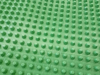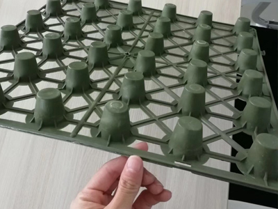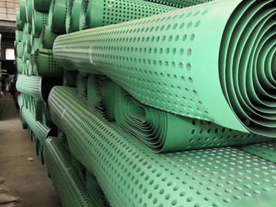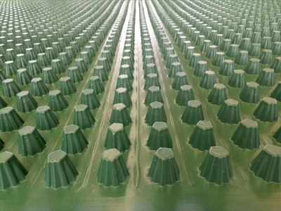 圓錐突臺的頂面膠接一層過濾土工布,以阻止泥土微粒通過,從而避免排水通道阻塞使孔道排水順暢。 傳統(tǒng)的排水方式使用磚石瓦塊作為導(dǎo)濾層、使用較多的鵝卵石或碎石作為濾水層、將水排到指定地點。而用排水板取代鵝卵石濾水層來排水則省時、省力又節(jié)能、節(jié)省投資、還能降低建筑物的荷載。
